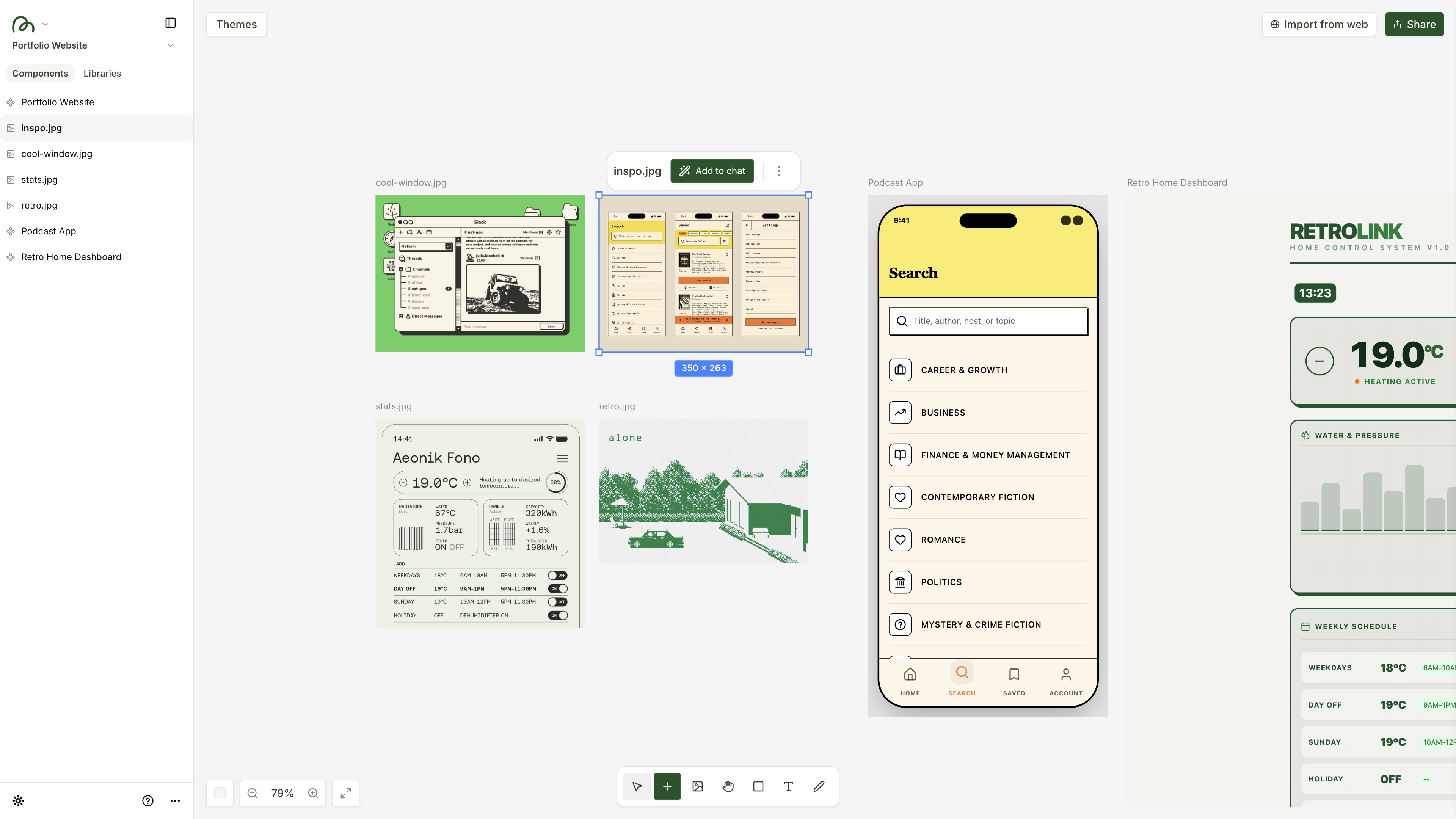 Create multiple design variants and flows without ever leaving the chat. Explore. Refine. Get to your vision faster.