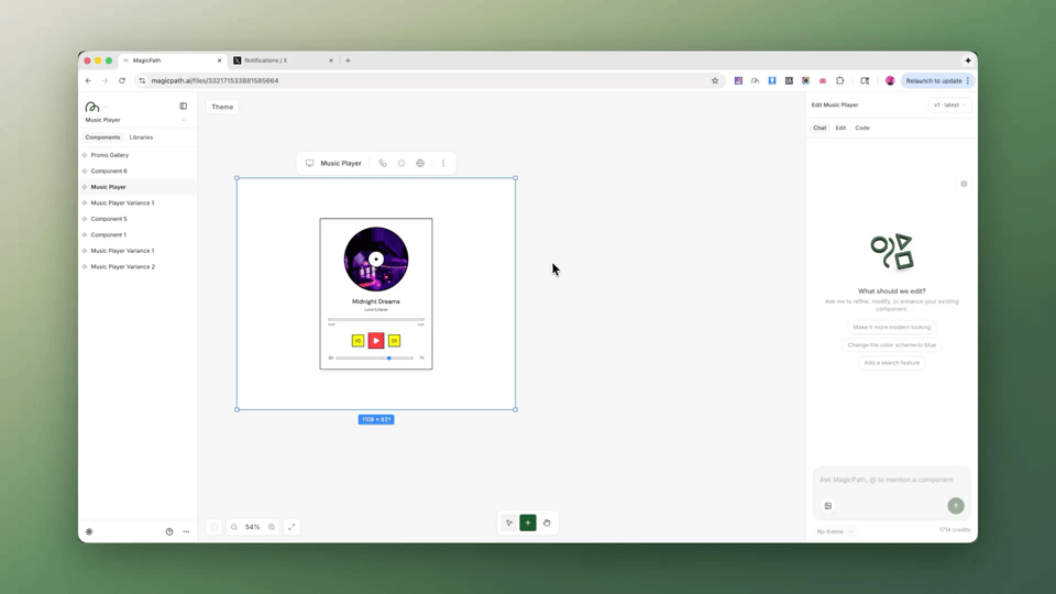 Simply paste the link and MagicPath will extract color palette, typography, and effects so you can use them to generate or edit your designs.