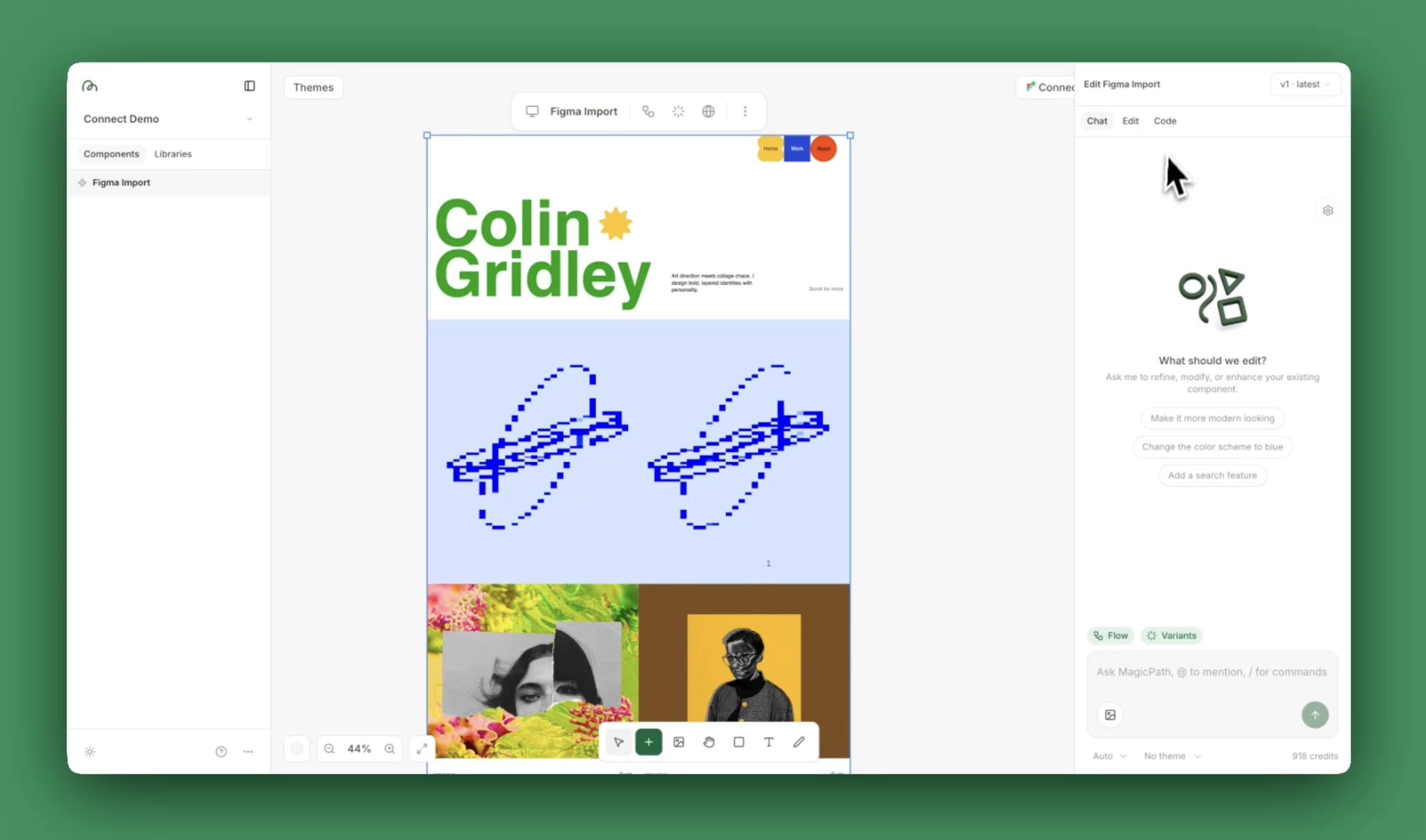 Once your design is in MagicPath, you can use AI to add interactivity, create hover states, build out , or generate . Your static Figma design becomes a living prototype you can share, test, and iterate on.