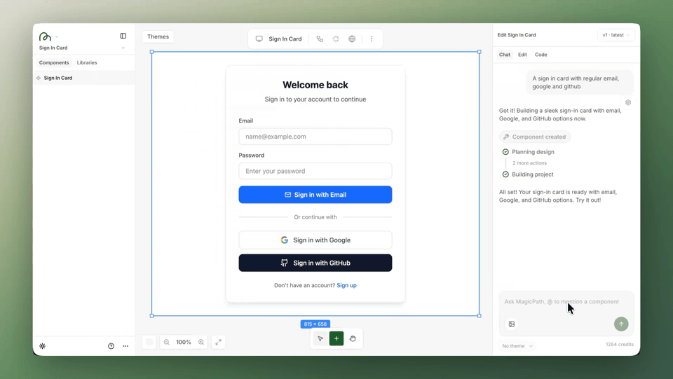 Use natural language to describe what you want to create - from simple components to complete pages. For example: "A sign in card with regular email, google and github" or "A landing page for a SaaS product"
